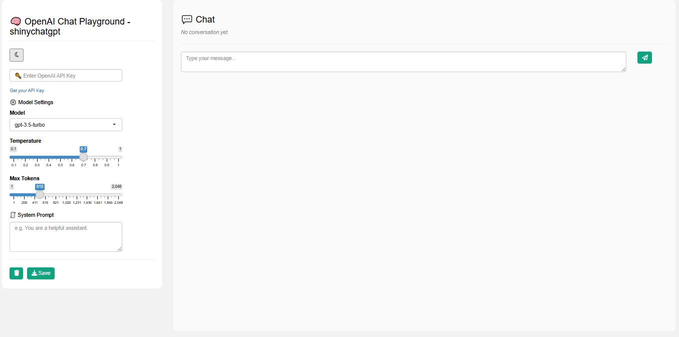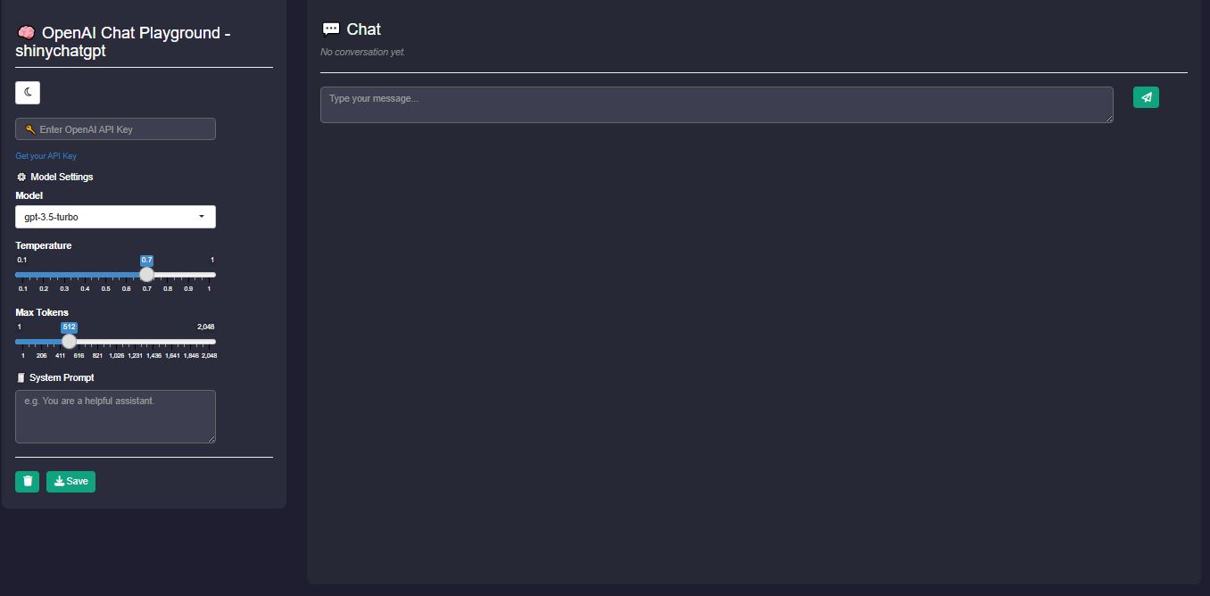 ShinyChatGPT is a fully functional ChatGPT clone built entirely in R using the Shiny framework. It provides a clean, interactive web interface to OpenAI’s Chat Completions API, allowing you to chat with models like GPT-3.5-turbo, GPT-4, and GPT-4o directly from your browser.